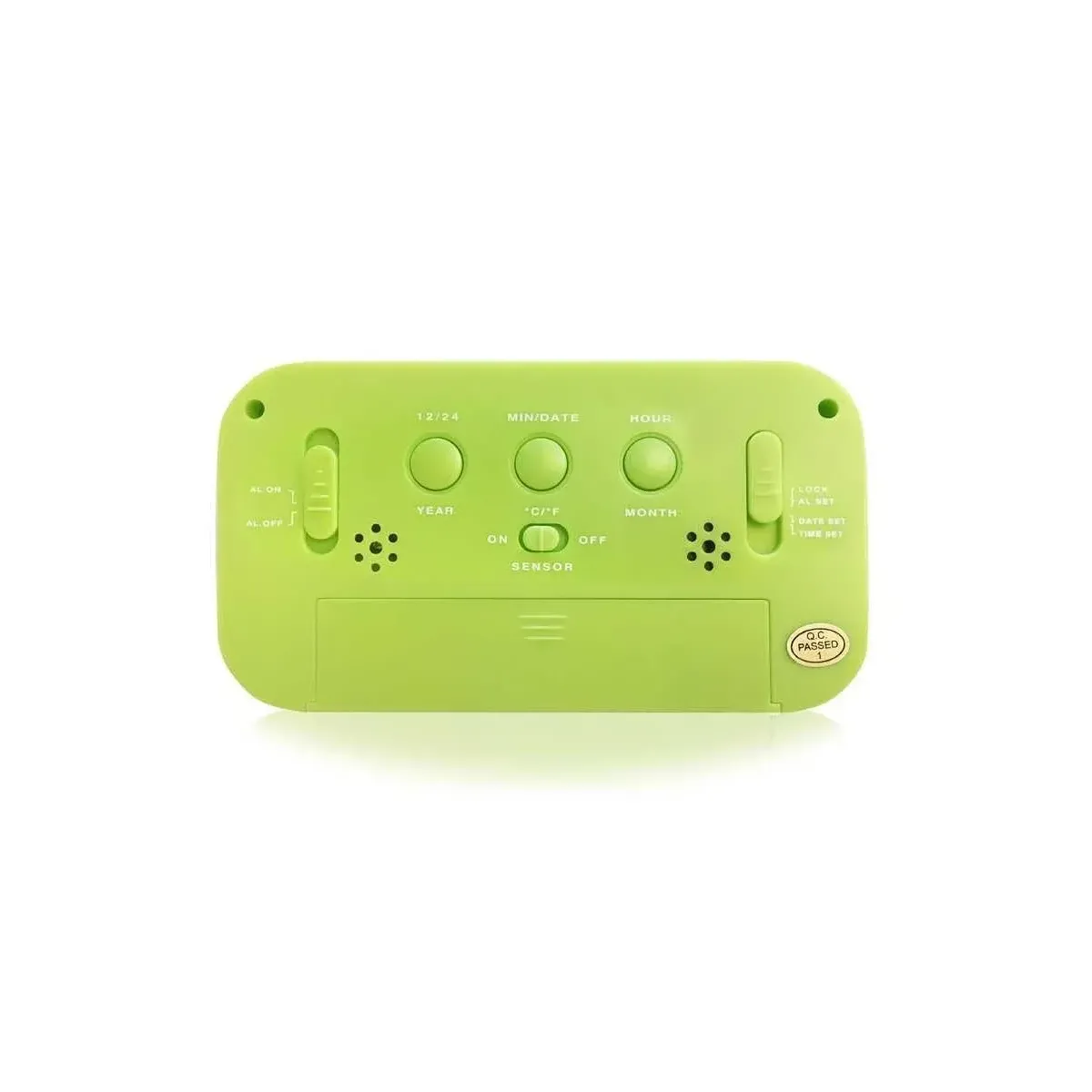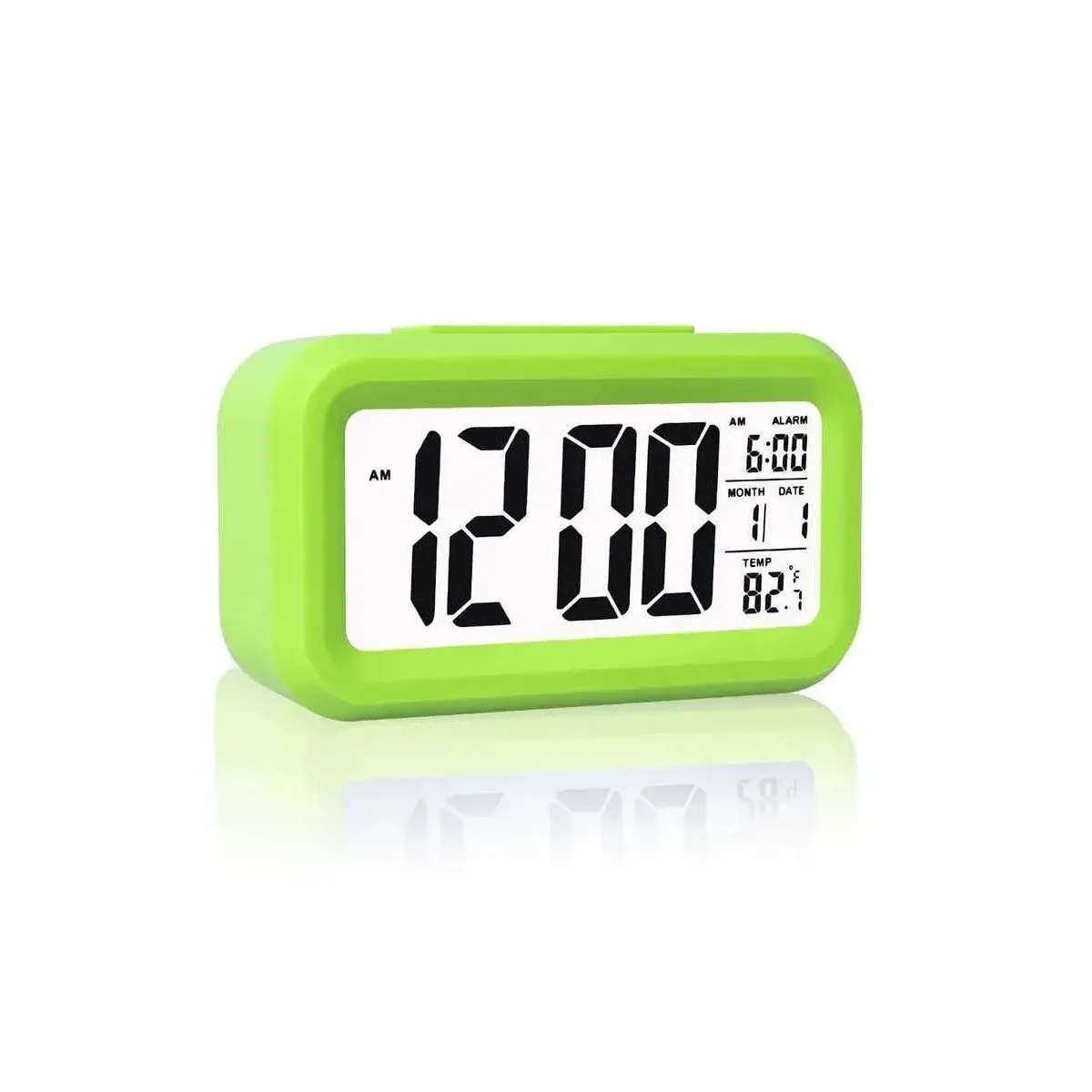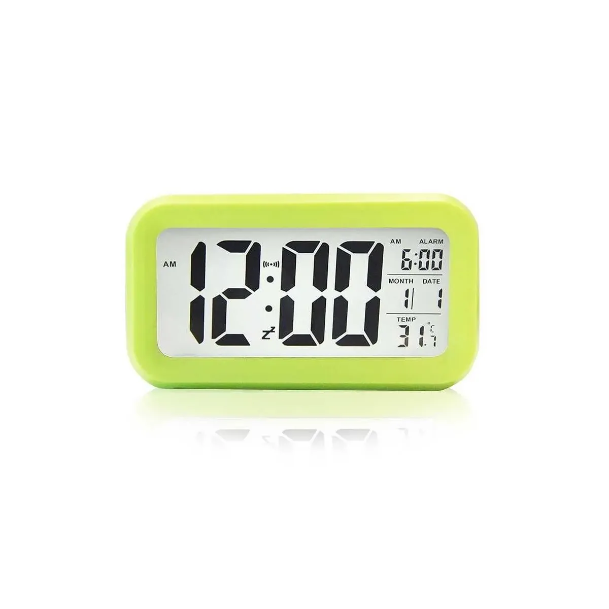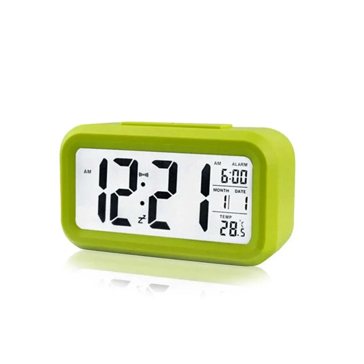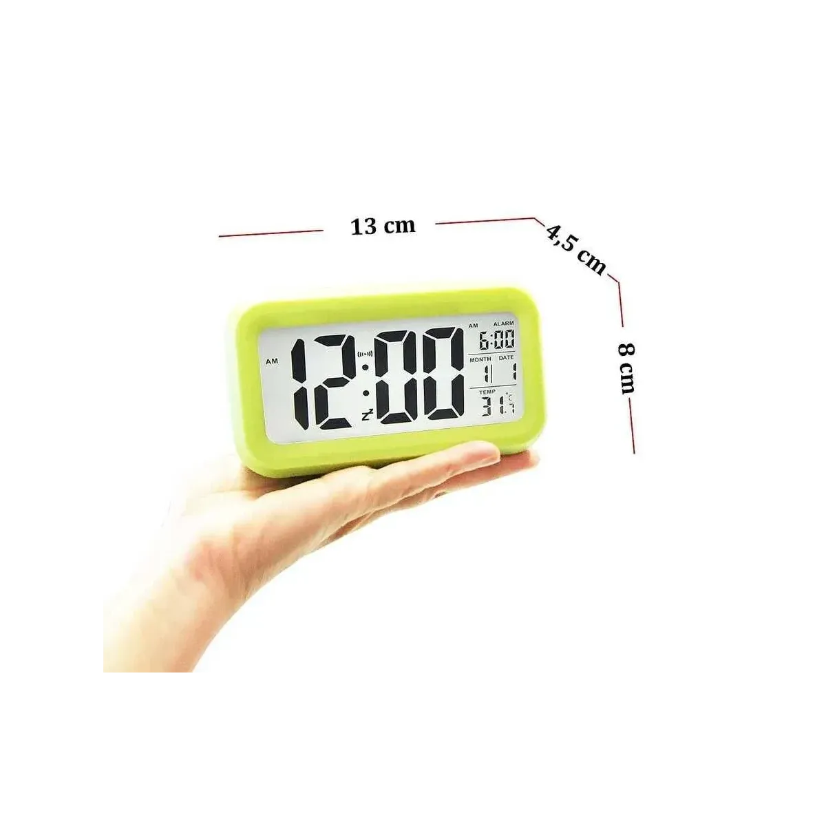 Yeşil masaüstü saat, takvim ve termometre özellikleriyle çok fonksiyonlu bir kullanım sunar. Büyük yazılar, alarm, snooze ve otomatik ışık ayarıyla pratik ve şık bir tasarıma sahiptir.