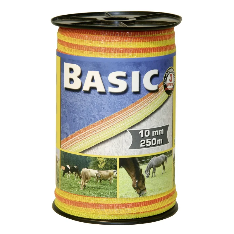 Pasture Fence Tape 250 m x 10 mm, 4 adet paslanmaz çelik iletkeni, sarı/turuncu görünürlüğü ve UV direncine sahip polietilen malzemesi ile, at ve büyükbaş hayvanların güvenliğini sağlayan etkili, dayanıklı ve uzun ömürlü bir elektrikli çit bandı çözümüdür.