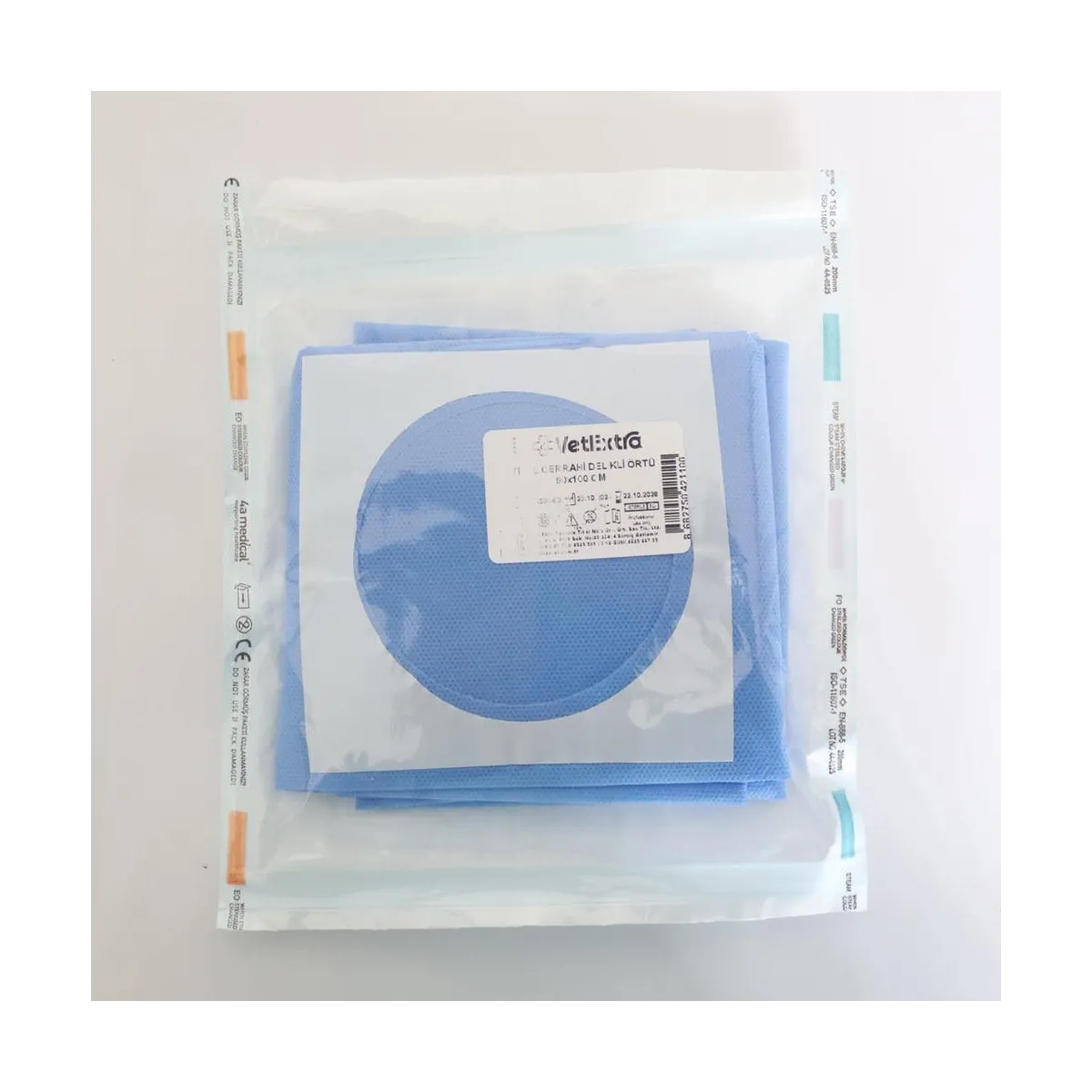 VetExtra Steril Cerrahi Delikli Serviyet Örtüsü 90×100 cm küçük cerrahi müdahalelerde steril çalışma alanı sağlamak için tasarlanmış tek kullanımlık SMS kumaş örtüdür.