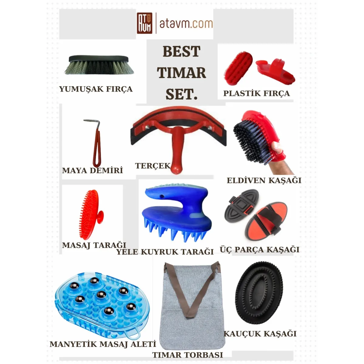 Soft Brush: Ideal for cleaning sensitive areas and polishing the coat. Plastic Brush: Removes coarse dirt and dried mud from the body. Hoof Pick: Designed for safely removing stones and dirt from under the hooves. Sweat Pick: Removes excess water/sweat from the body after washing or in case of heavy sweating. Glove Brush: Worn on the hand, it adapts to the body contours and provides deep cleaning. Massage Comb: Improves blood circulation and helps the horse relax. Mane and Tail Comb: Allows for gentle combing of the mane and tail hairs without breakage. Three-Piece Grooming Brush: Offers versatile use with its adjustable structure and different tooth options. Magnetic Massager: Provides a professional massage experience that reduces muscle fatigue thanks to its ball bearing mechanism. Rubber Grooming Brush: A soft yet effective tool for removing dead hair from horses with sensitive skin. Grooming Bag: Allows for organized storage and easy transport of the entire set.