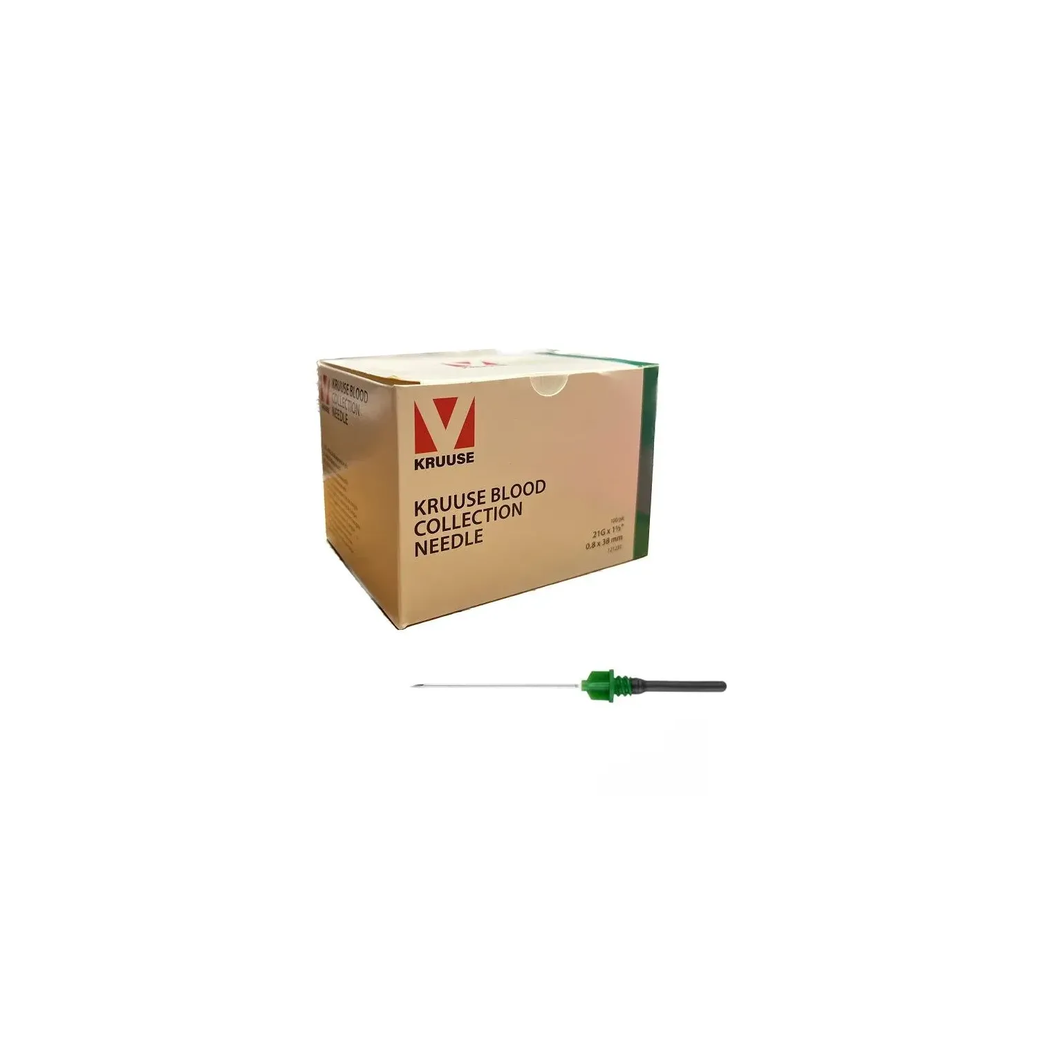 Kruuse Blood Collection Needle 21G x 1½ (0.8 x 38 mm), green color-coded, sterile, single-use needle made of stainless steel. It is supplied in packs of 100.