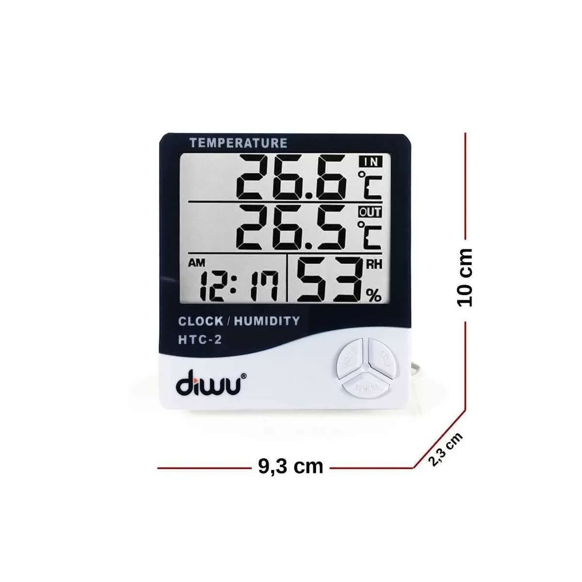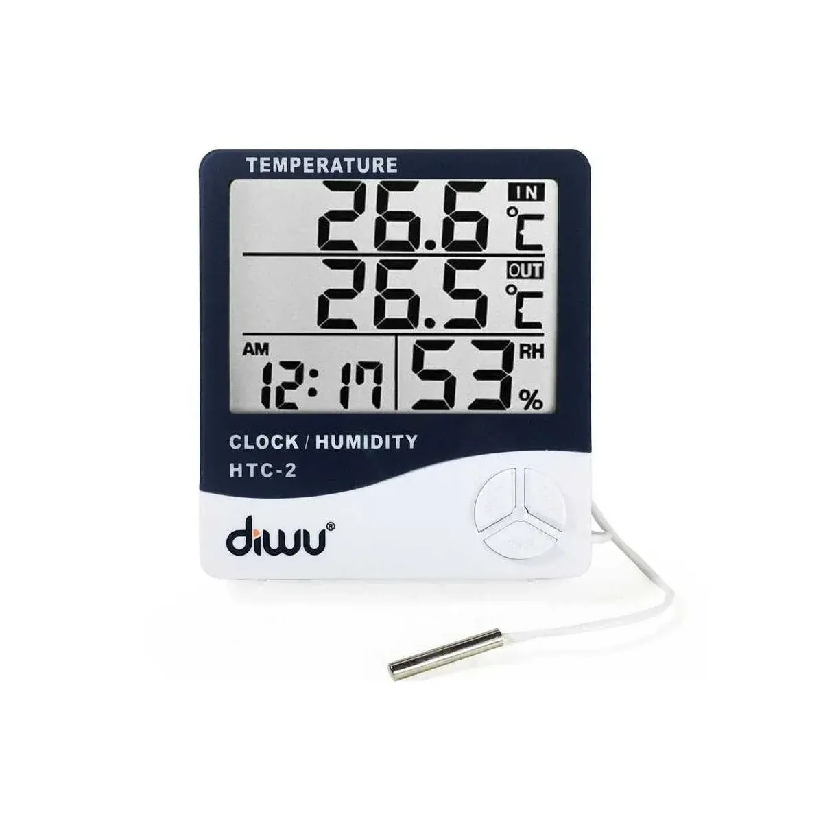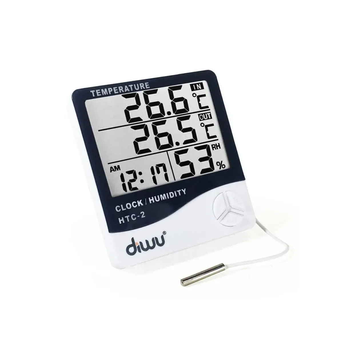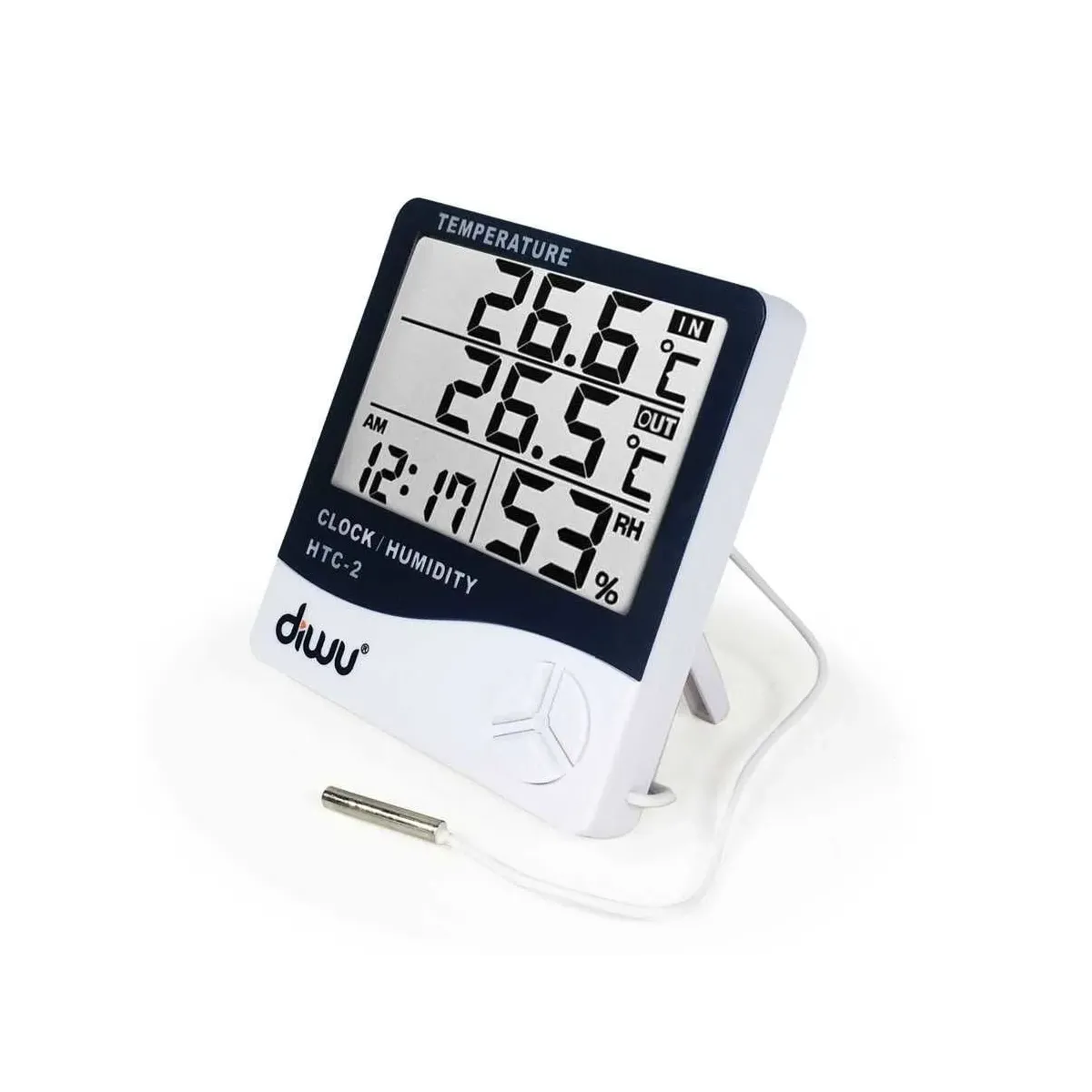 The Diwu Thermometer-Hygrometer HTC-2 (with probe, humidity and temperature meter) is a functional and reliable device designed for indoor measurements. Offering temperature, humidity, and clock functions all in one, it provides an easy and practical solution for use in your home, office, or hobby areas.